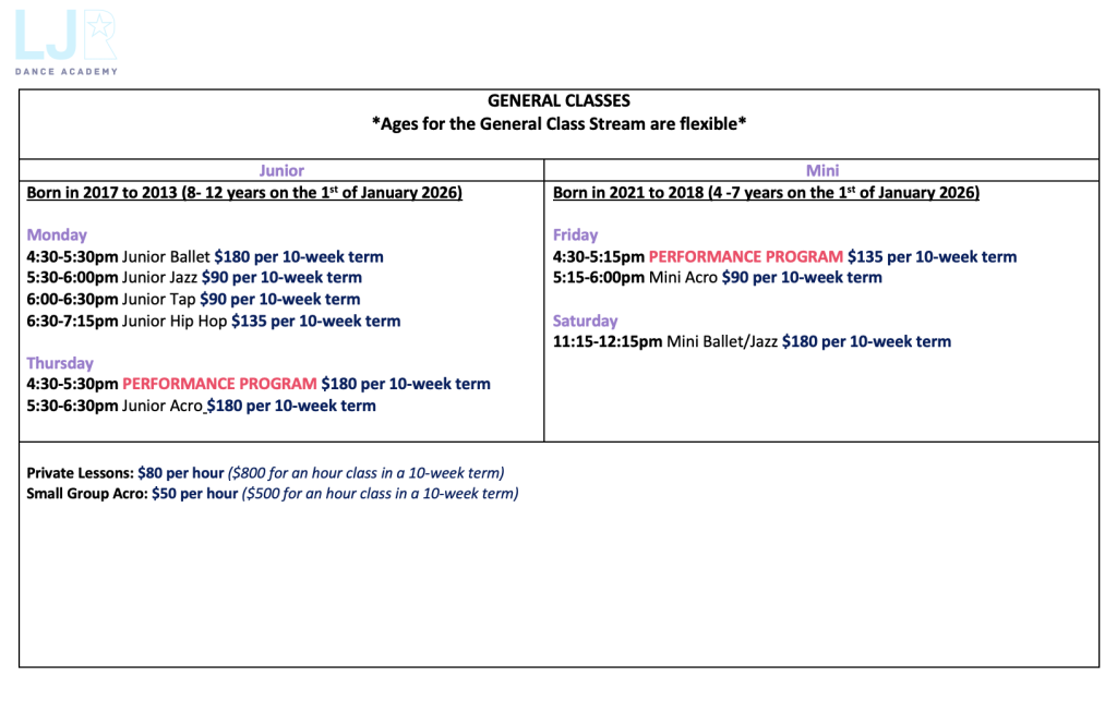 Please see below for the General Classes for your dancers age group.